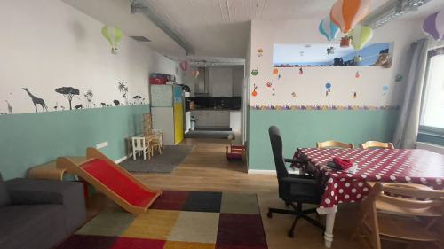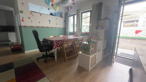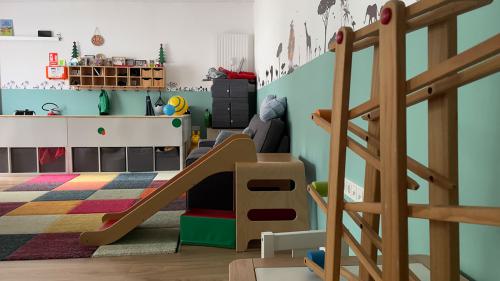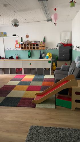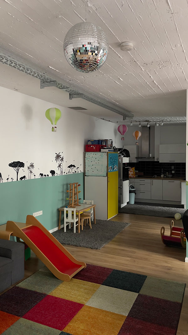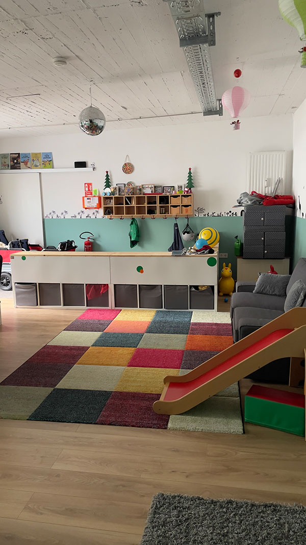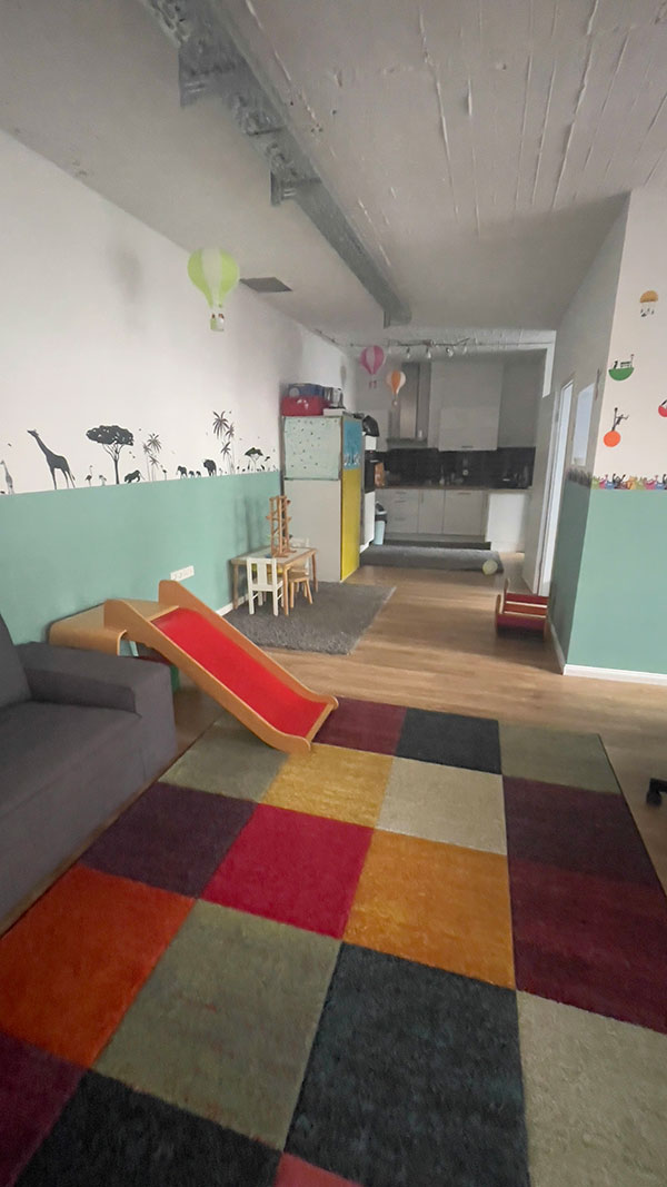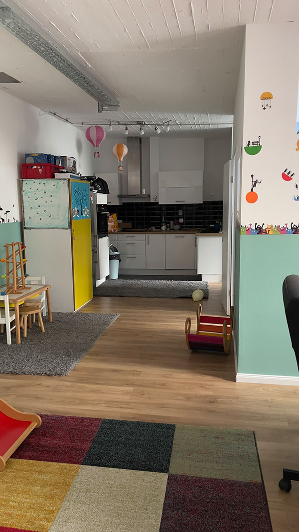 Auf eine Fläche von 70 qm gibt es einen großen offenen Raum mit ausreichend Platz für Spiel, Kreativ- uns Bewegungsangebote. Im hinteren Teil, befindet sich eine offene Küche, der Essensplatz und ein Badezimmer sowie eine separater Schlafraum. Eine große Fensterfront sorgt für viel Licht. Die Räumlichkeit ist durchgehend barrierefrei. Von der Tagespflege ist der Stadtwald und diverse Spielplätze zu Fuß gut zu erreichen. Zu dem gibt es fußläufig zahlreiche Einkaufsmöglichkeiten und eine gute Anbindung an die öffentlichen Verkehrsmittel ( Bahn 1, 13 und 7 und Bus 140 , 172, 173 )